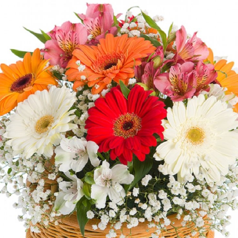 Букет состоит из MIX из 9 гербер, 4 альстромерии, 4 ветки гипсофилы, корзина, оазис.