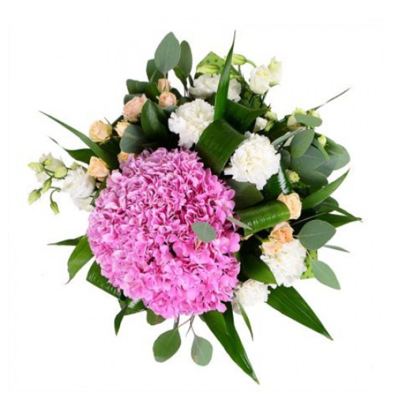 Букет состоит из 1 гортензия розовая, 5 белых гвоздик, 2 кустовых розы, 3 эустомы, эвкалипт, зелень, красивая упаковка, атласная лента.