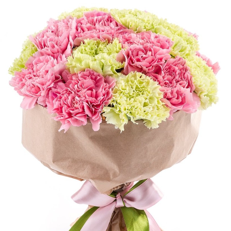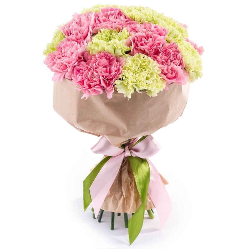 Букет состоит из 8 розовых гвоздик, 7 зеленых гвоздик, крафт, атласная лента.