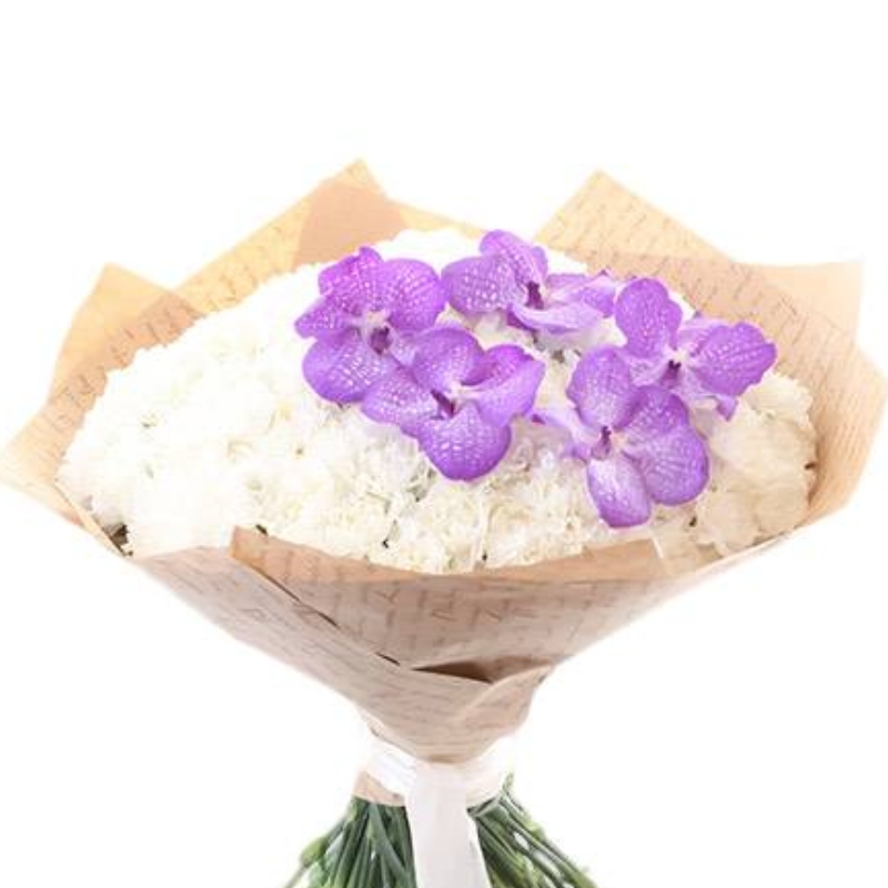 Букет состоит из 35 белых гвоздик, 1 орхидея, крафт, атласная лента.