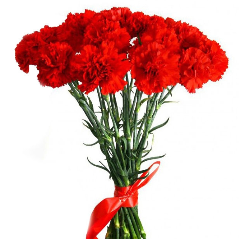 Букет состоит из 17 красных гвоздик, прозрачная упаковка, красная лента.