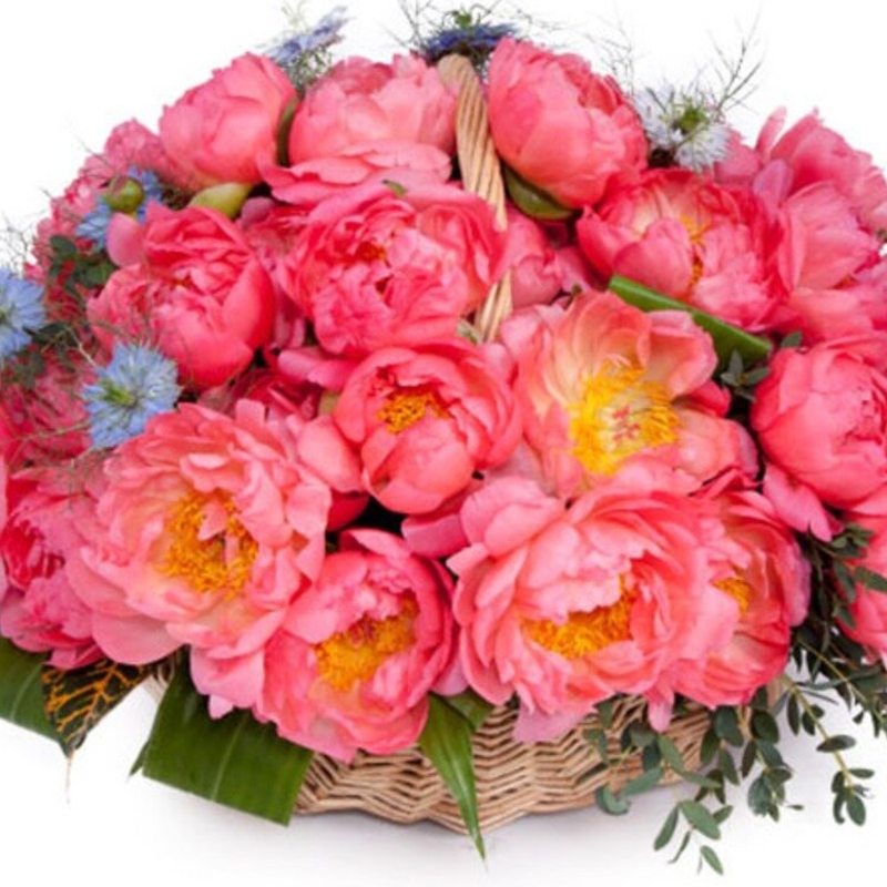 Корзина из 31 пиона с декоративной зеленью