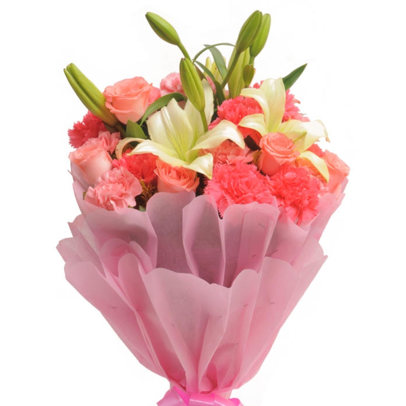 Букет состоит из 10 розовых гвоздик, 7 розовых роз, 2 ветки белой лилии, красивая упаковка, атласная лента.