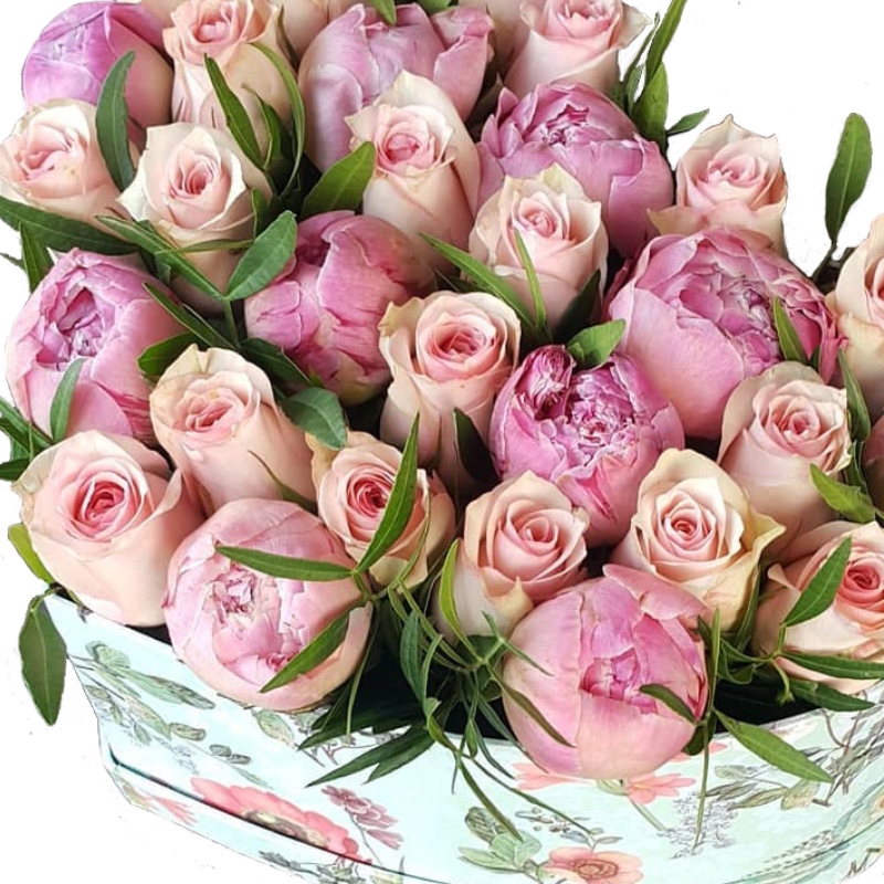 Букет состоит из 20 роз, 11 пионов, зелень, коробка в виде сердца, оазис.