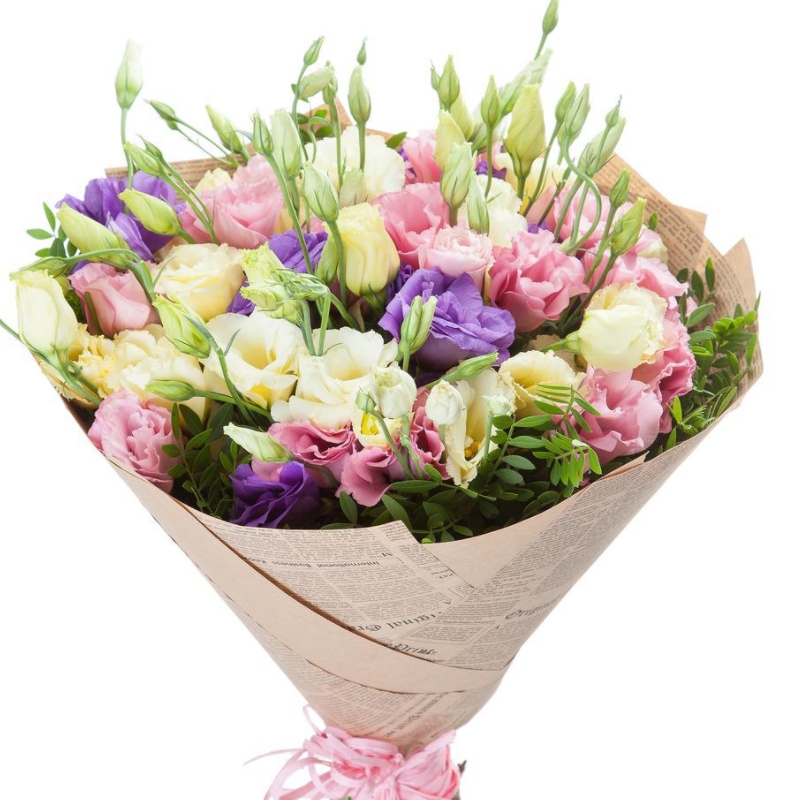 Букет состоит из MIX из 17 веток эустомы, зелень, крафт, атласная лента.