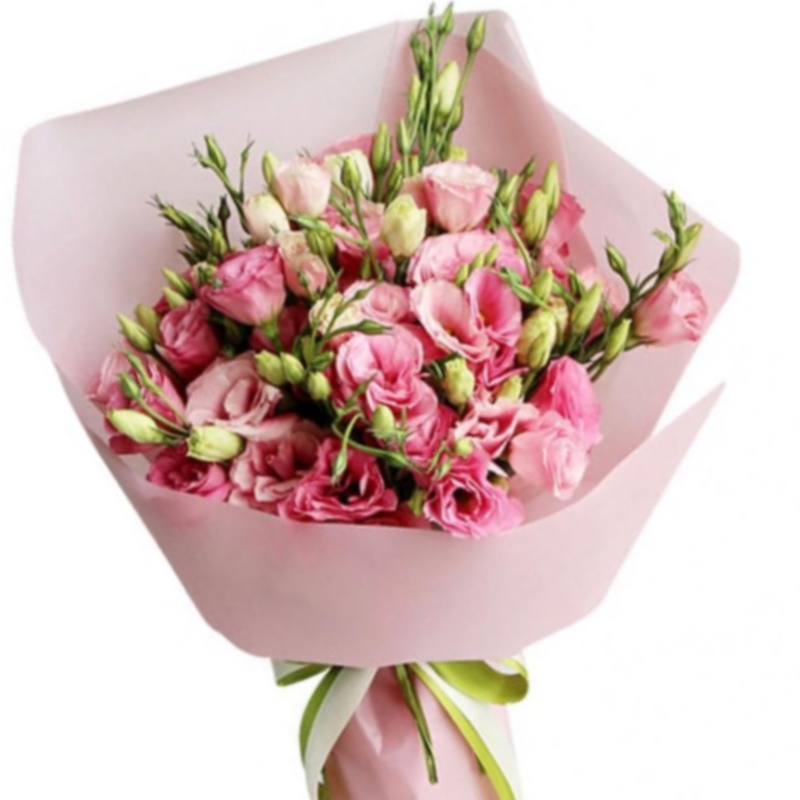 Букет состоит из 11 веток розовой эустомы, красивая упаковка, атласная лента.