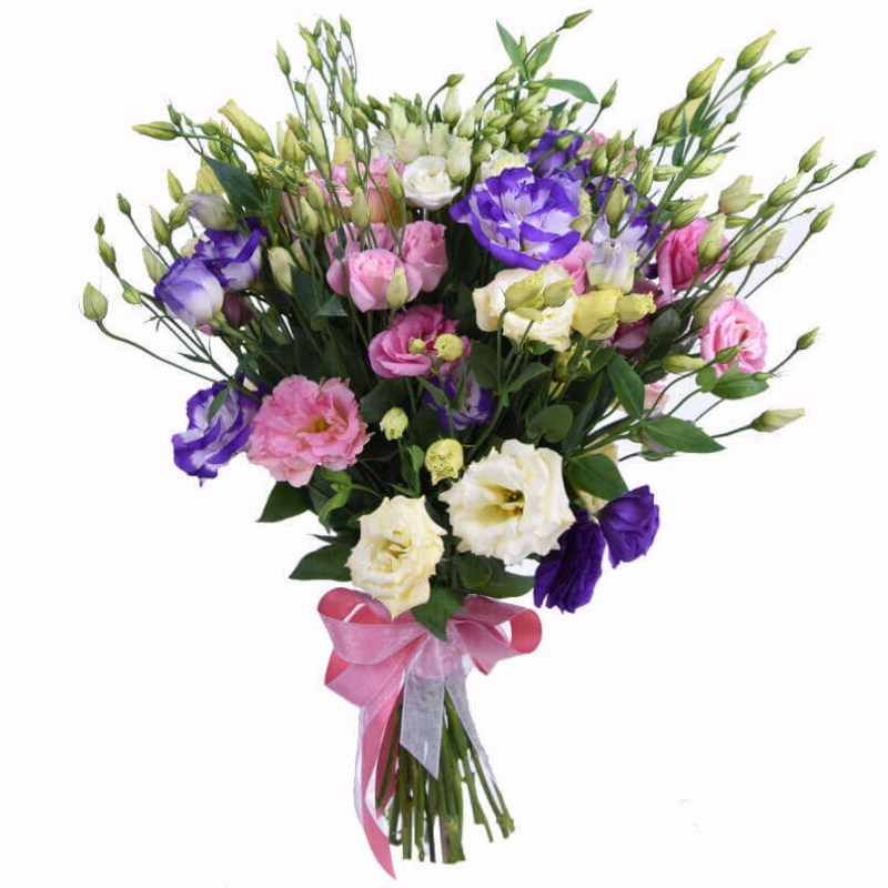 Букет состоит из MIX из 15 веток эустомы, прозрачная упаковка, атласная лента.