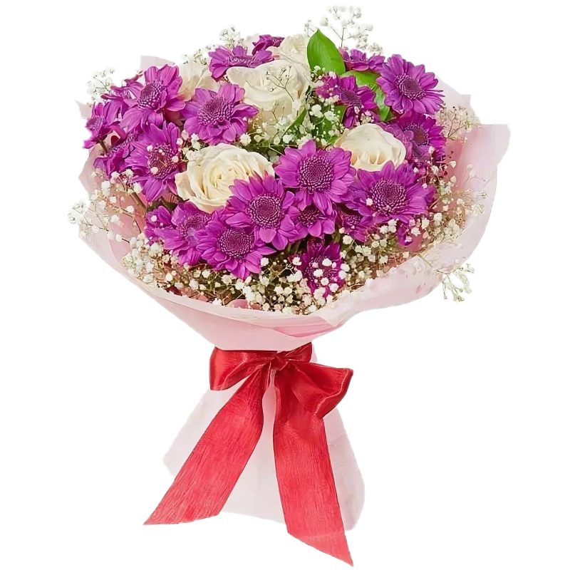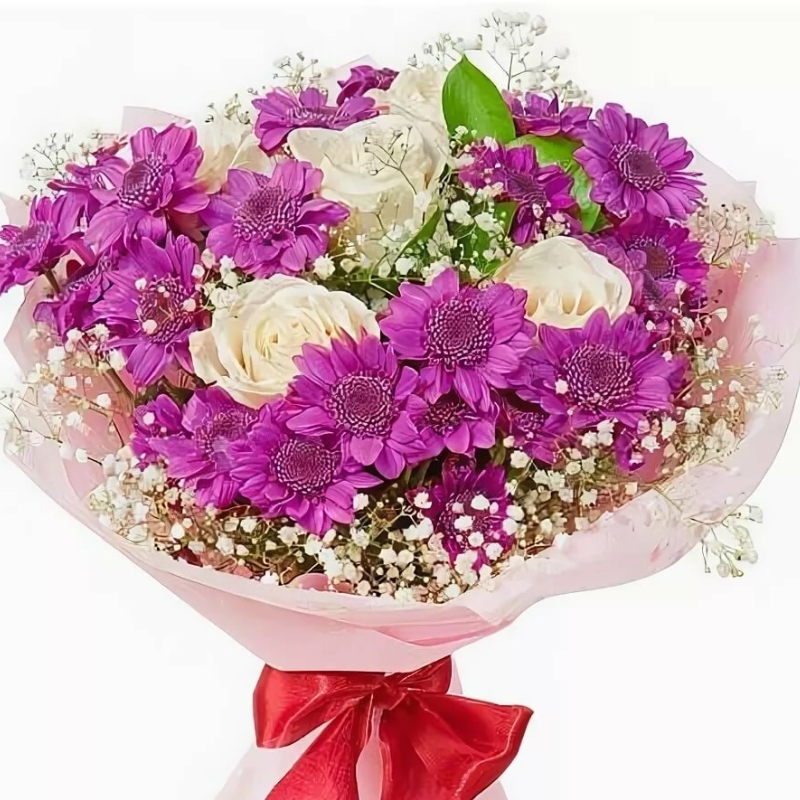 Букет состоит из 5 белых роз, 4 ветки хризантемы, 3 ветки гипсофилы, красивая упаковка, атласная лента.