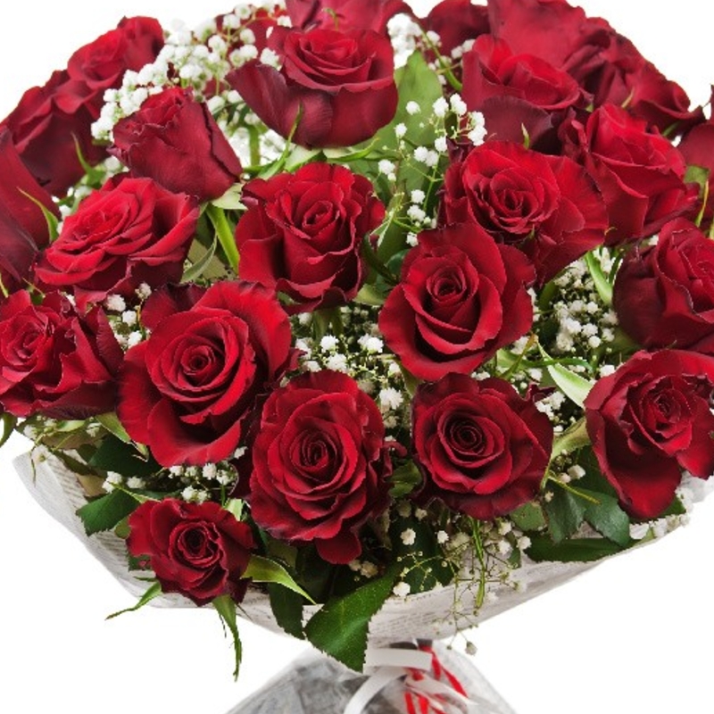 Букет состоит из 31 красная роза, 7 гипсофила, красивая упаковка, атласная лента.