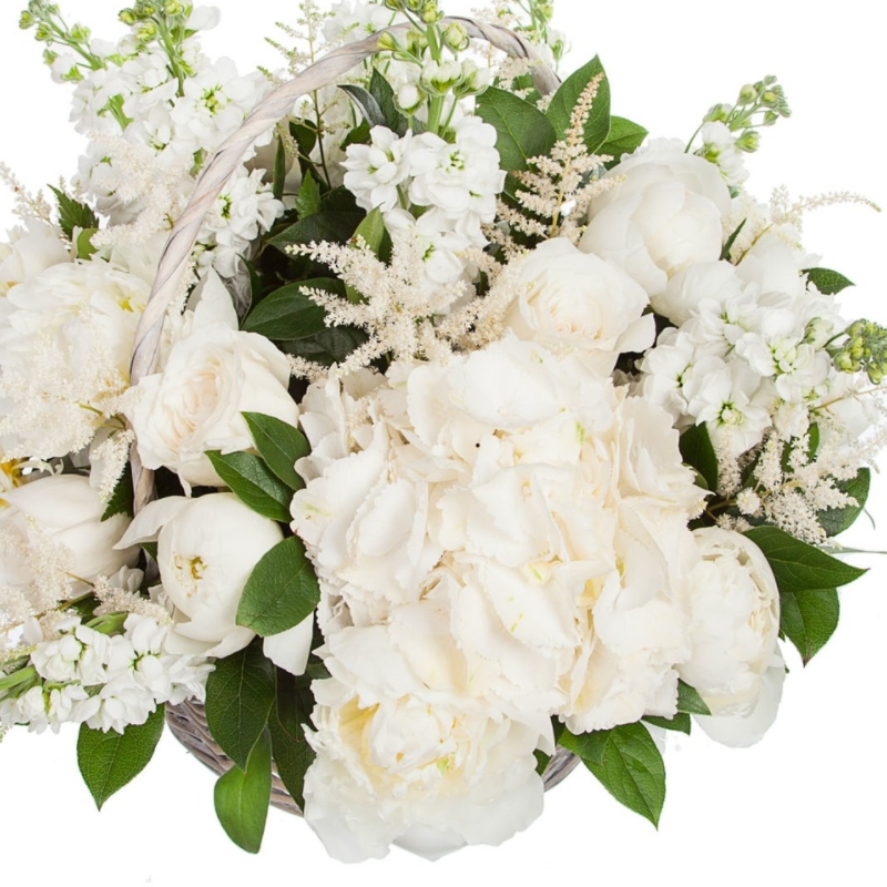 Букет состоит из 1 гортензия, 7 пионов, 5 роз, 5 веток маттиолы, 9 астильба, зелень, корзина, оазис.