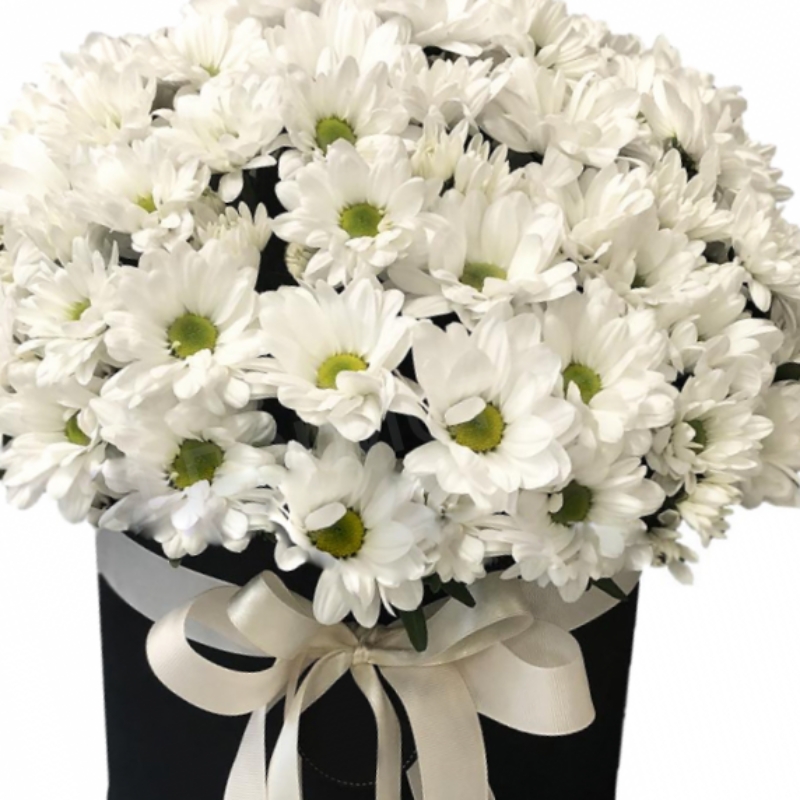 15 веток белых ромашковых хризантем, черная коробка, белая лента.