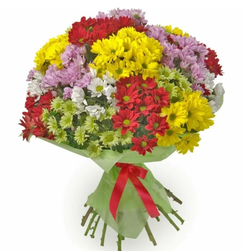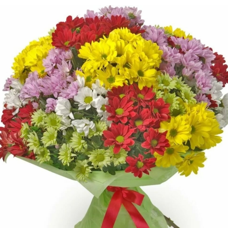 Букет состоит из 5 зеленых хризантем, 5 белых хризантем, 5 желтых хризантем, 5 розовых хризантем, 5 красных хризантем, красивая упаковка, атласная лента.