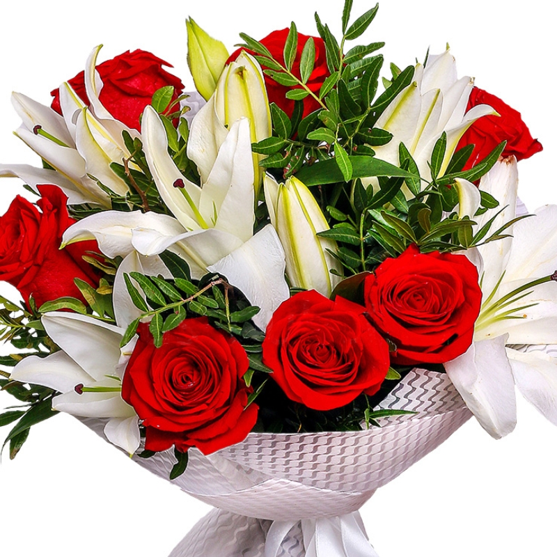 Букет состоит из 7 красных роз, 3 ветки белой лилии, красивая упаковка, атласная лента.