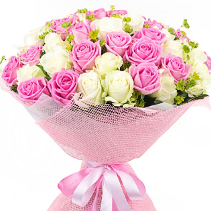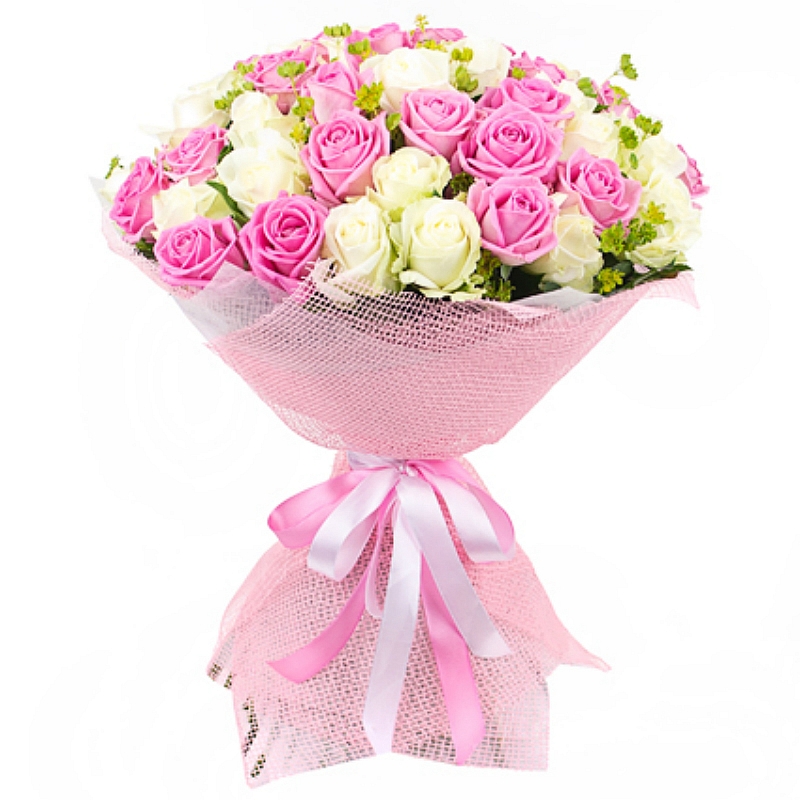 Букет состоит из 26 розовых роз, 25 белых роз, зелень, красивая упаковка, атласная лента.