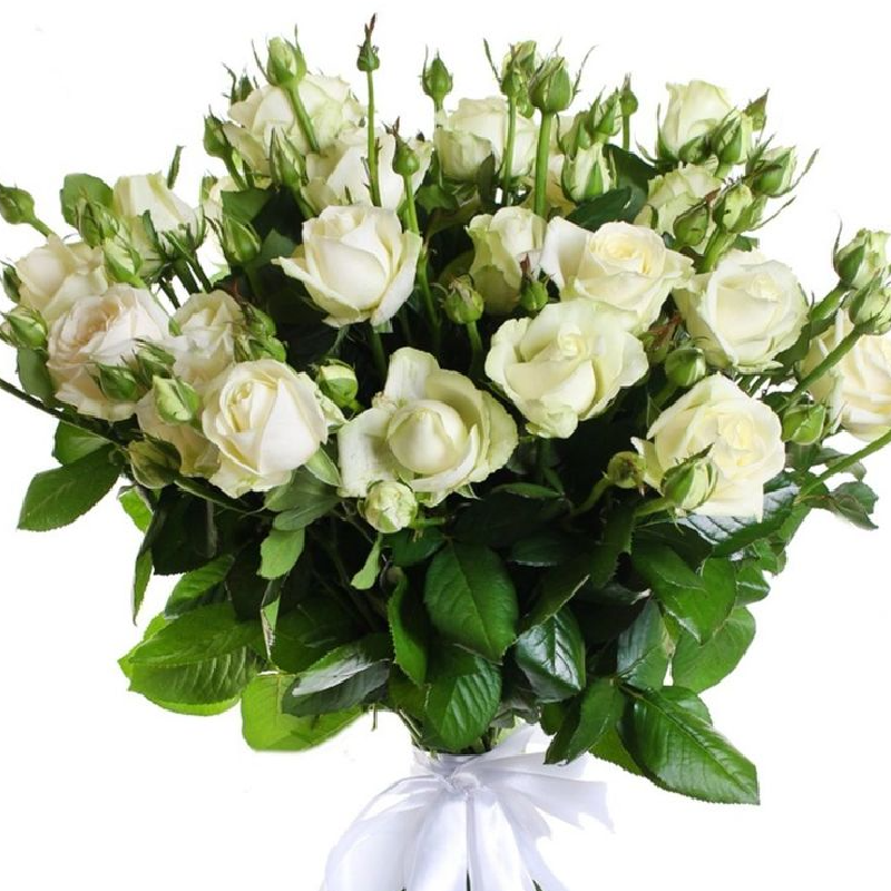 Букет состоит из 17 белых кустовых роз, прозрачная упаковка, атласная лента.