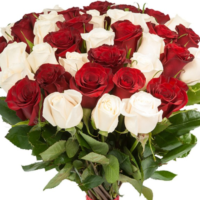 Букет состоит из 23 красные розы, 22 белые розы, прозрачная упаковка, атласная лента.