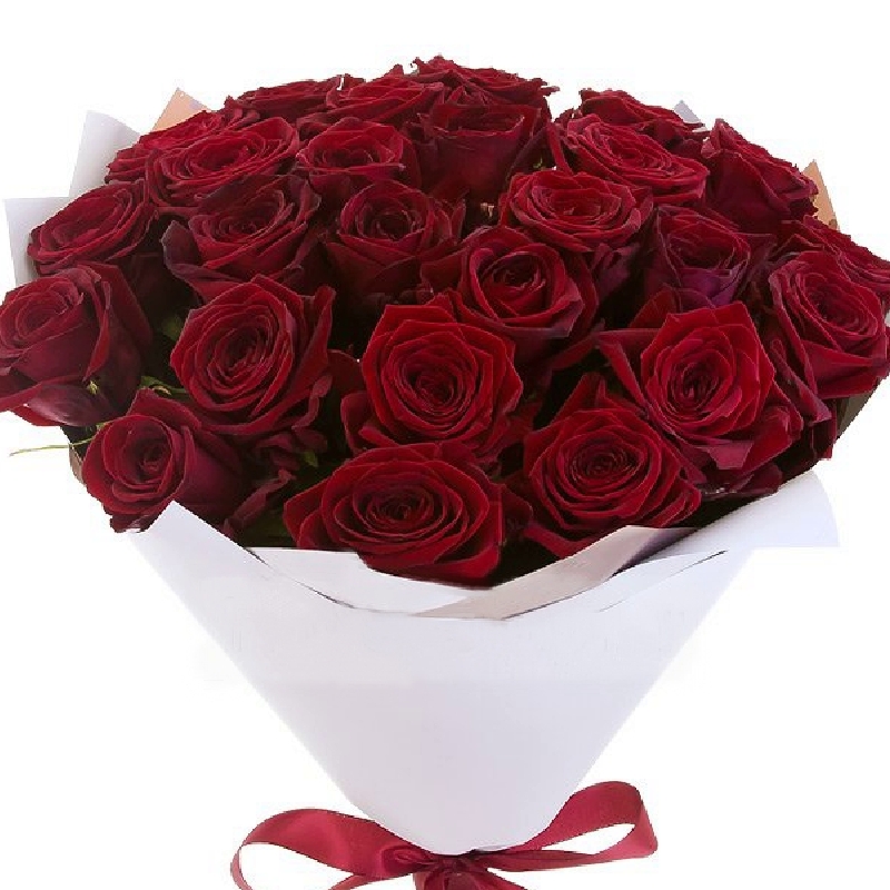 Букет состоит из 25 бордовых роз, крафт, атласная лента.