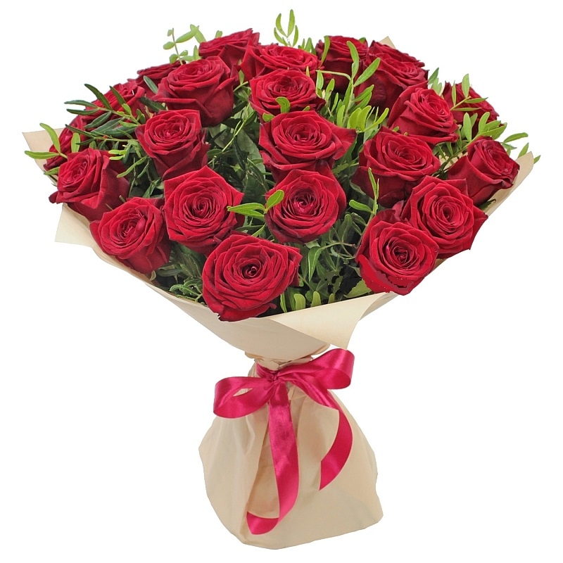 Букет состоит из 25 роз, писташ, крафт, атласная лента.