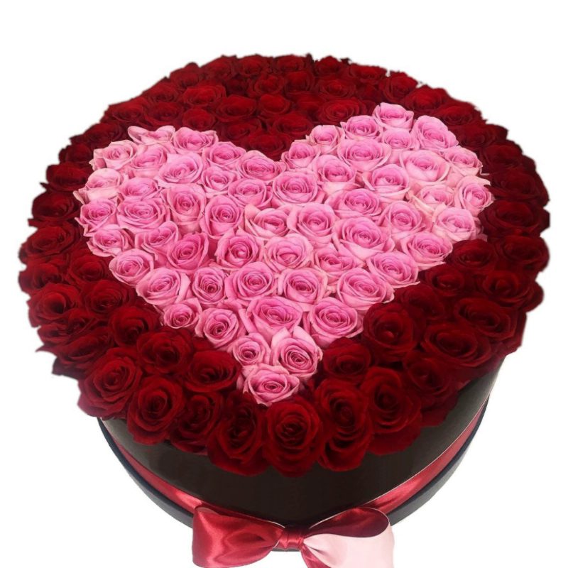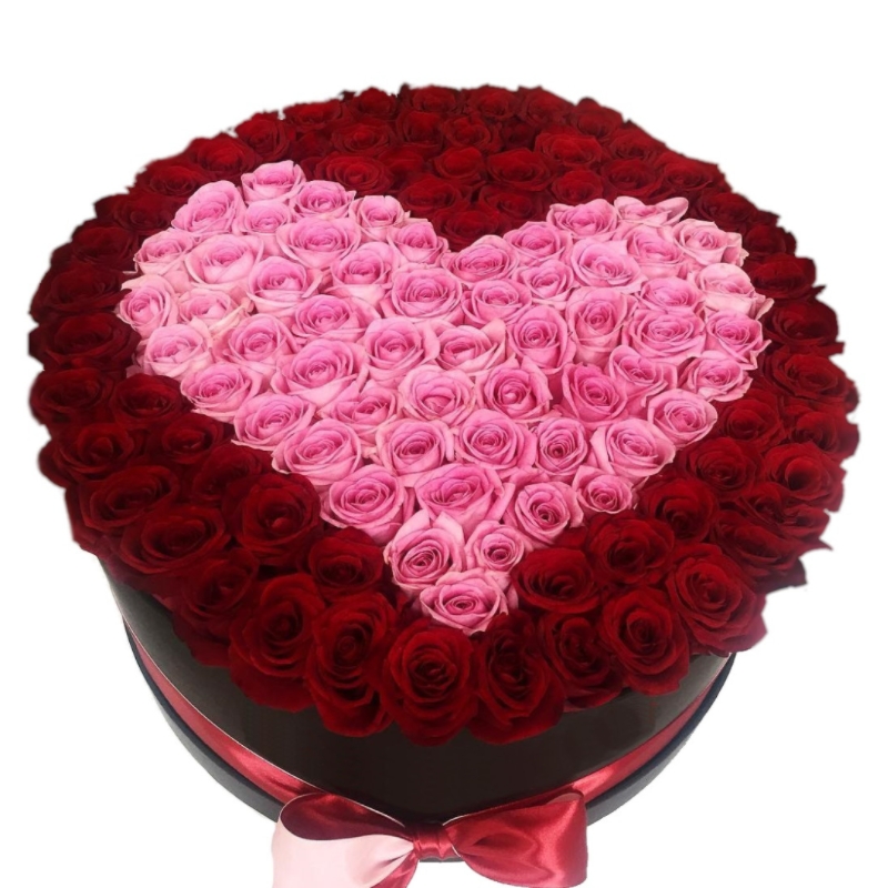 Сердце из 101 красной и розовой розы в коробке