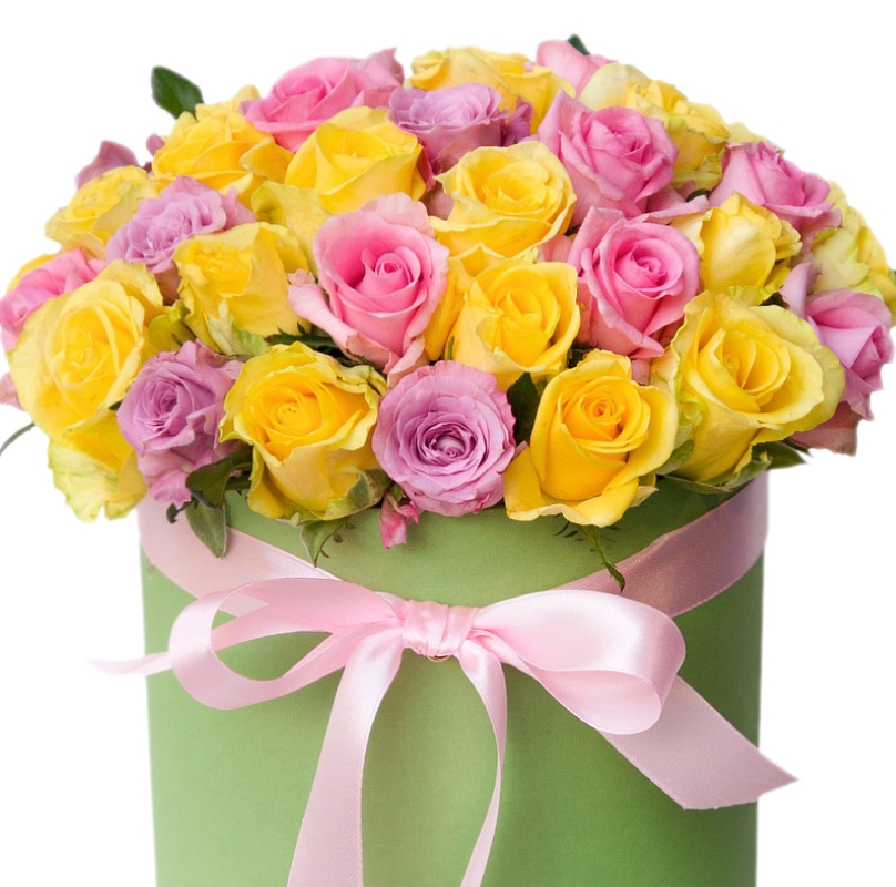 Букет состоит из 26 розовых роз, 25 желтых роз, коробка, атласная лента.