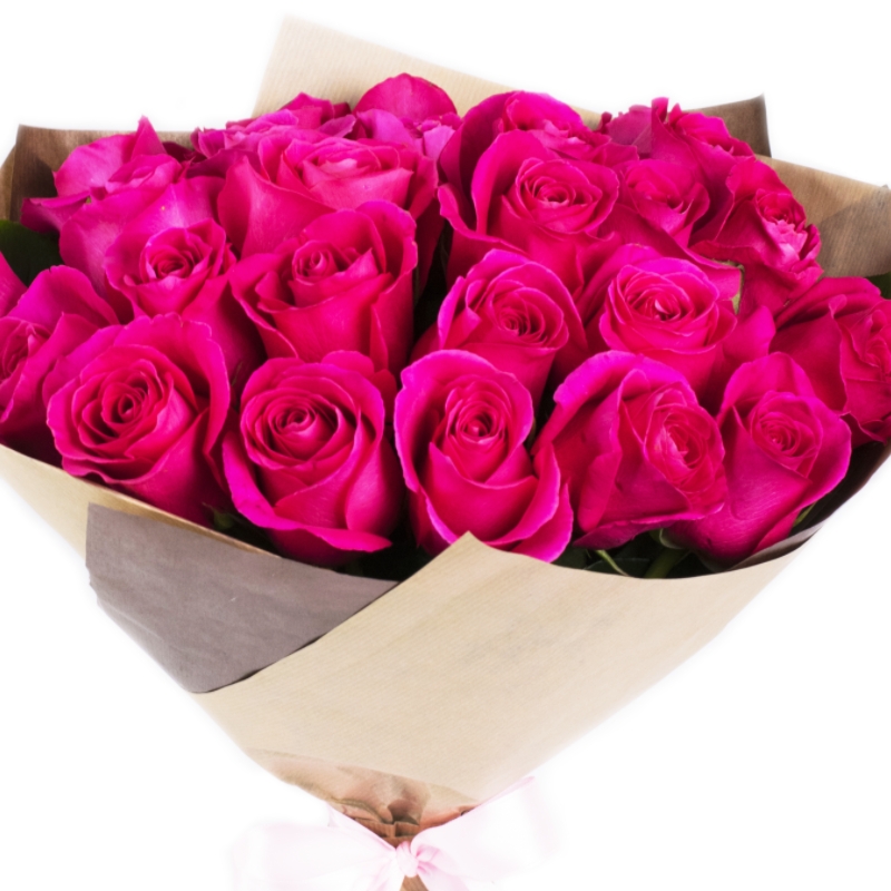 Букет состоит из 21 малиновая роза, крафт, атласная лента.