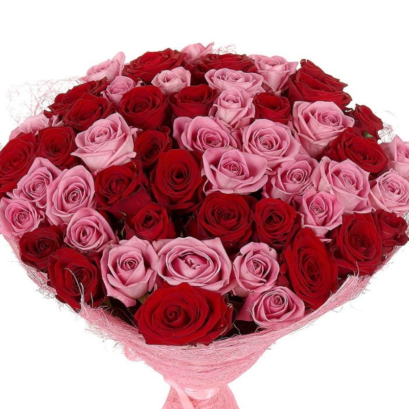 Букет состоит из 23 красной розы, 22 розовой розы, розовая упаковка, розовая или красная лента.