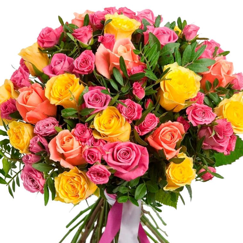 Букет состоит из 11 желтых роз, 7 коралловых роз, 5 розовых роз, 9 веток розовой розы, прозрачная упаковка.
