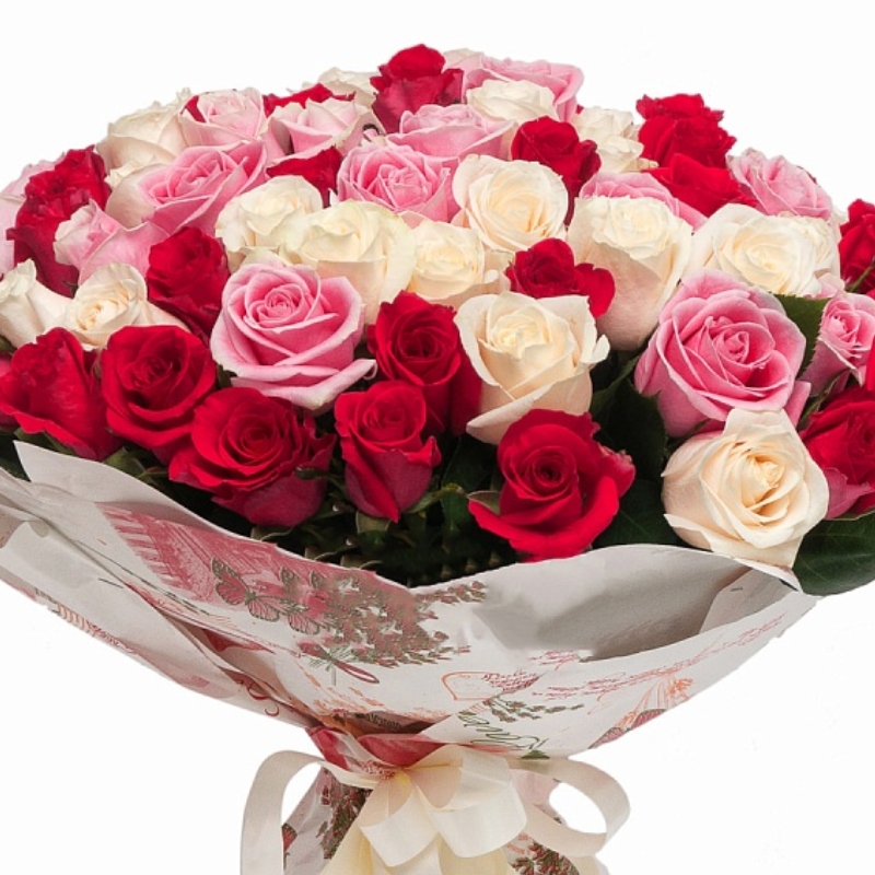 Букет состоит из MIX из красной / белой и розовой розы, красивая упаковка.