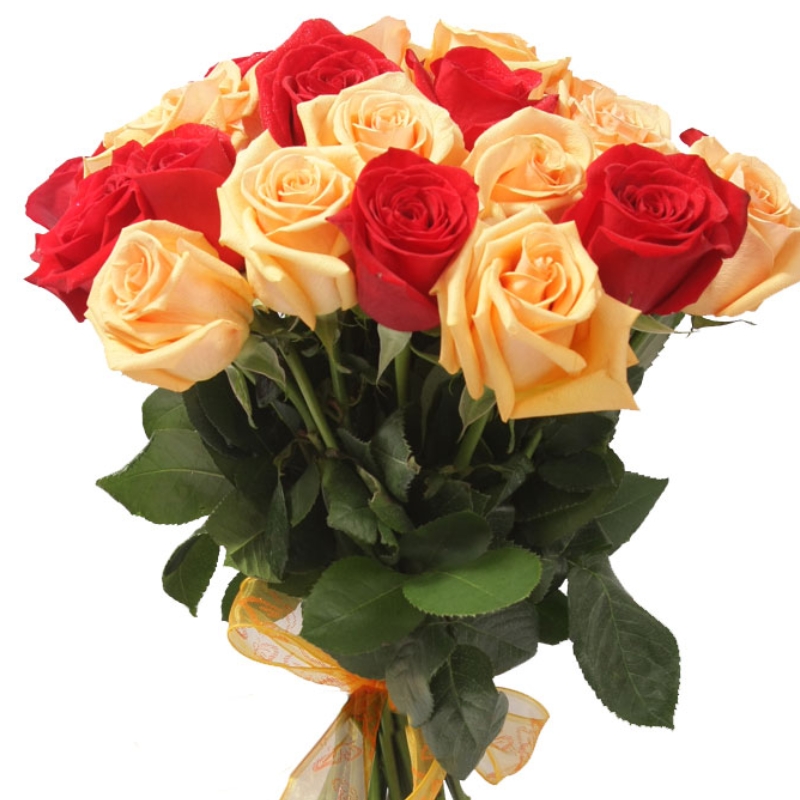 Букет состоит из 10 кремовых роз, 9 красных роз, прозрачная упаковка, атласная лента.