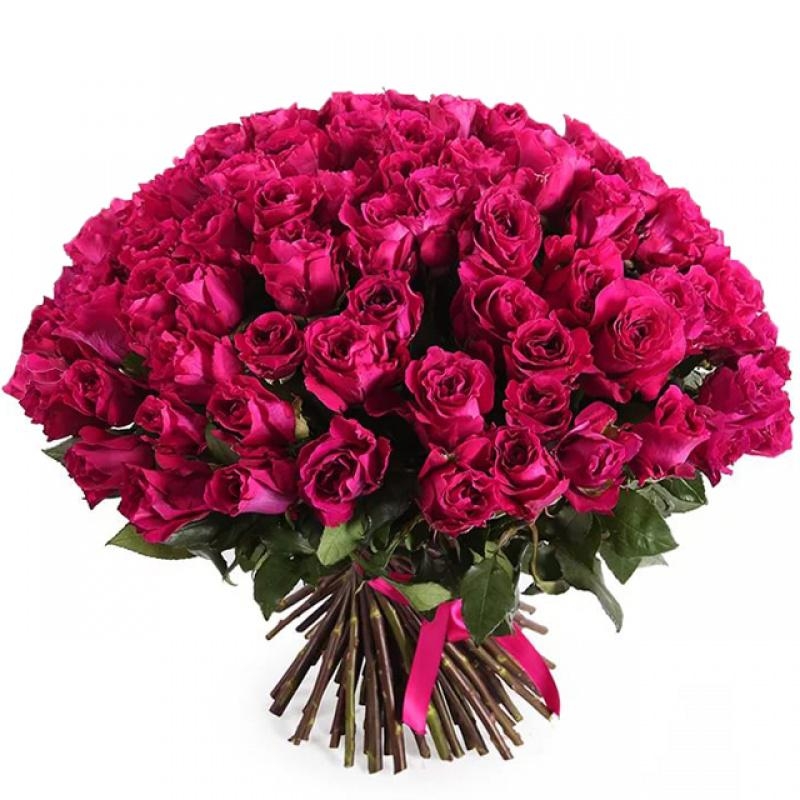 Букет состоит из 75 коралловых роз, прозрачная упаковка, атласная лента.