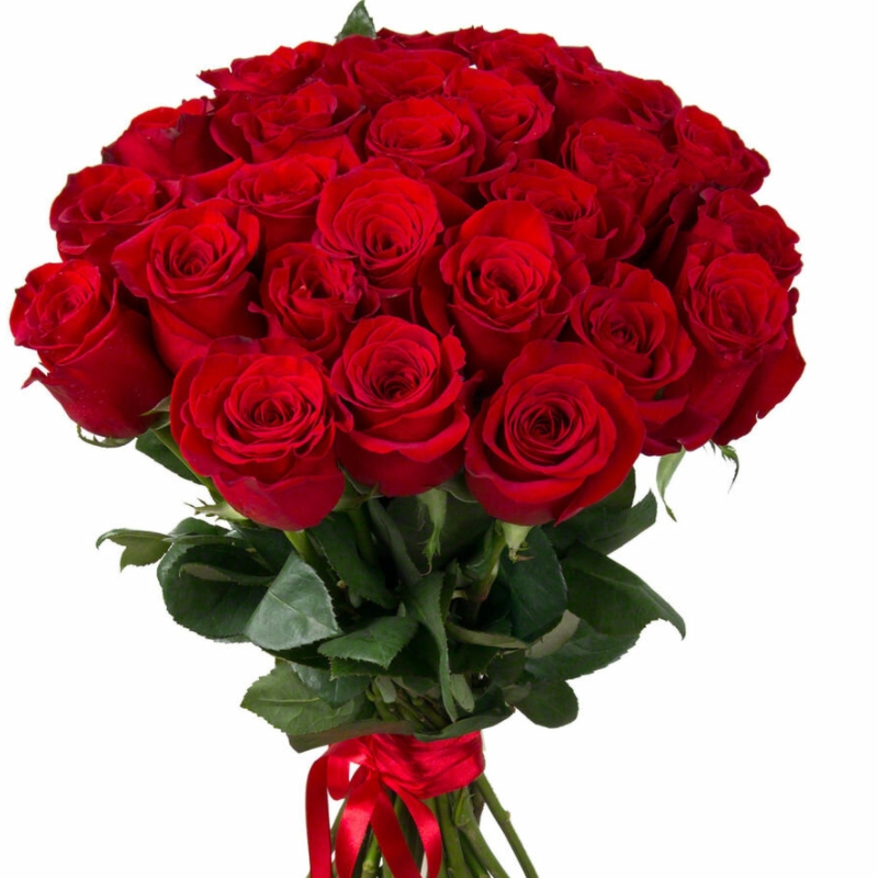 Букет состоит из 27 красных роз, прозрачная упаковка, атласная лента.