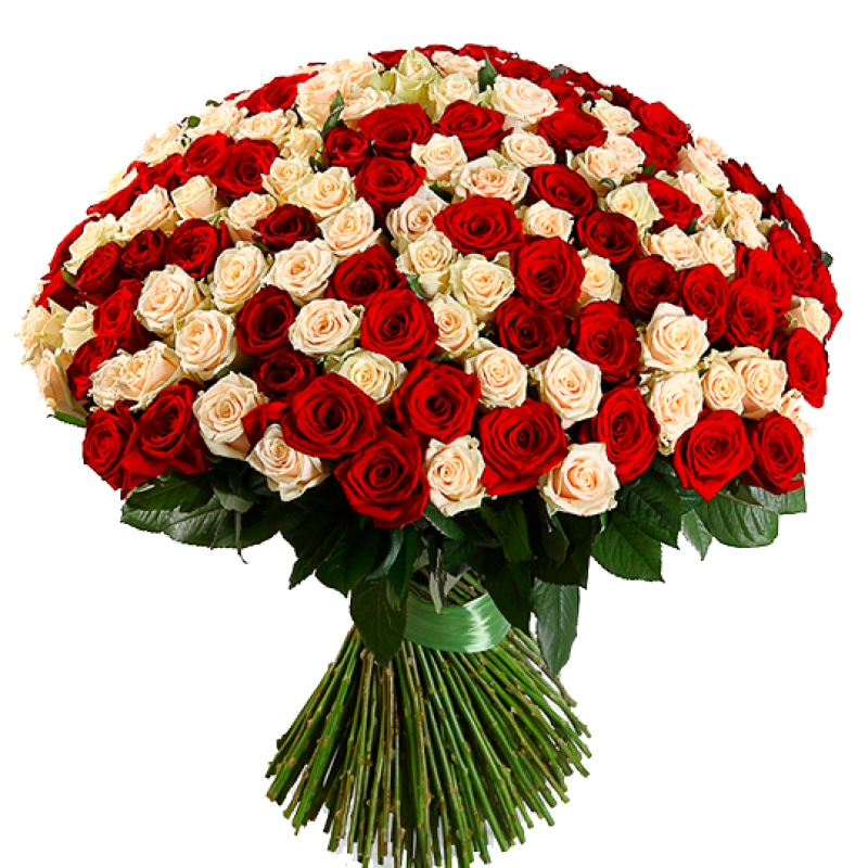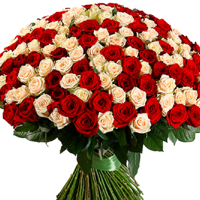 Букет состоит из MIX из 201 красной и кремовой розы, прозрачная упаковка, атласная лента.