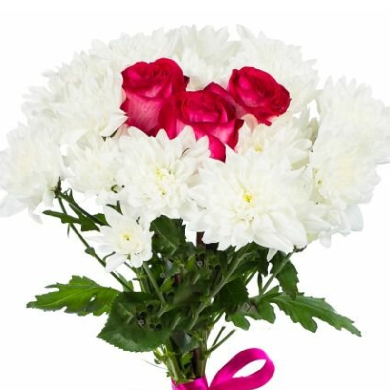 Букет состоит из 3 красные розы, 4 ветки белой хризантемы, прозрачная упаковка, атласная лента.