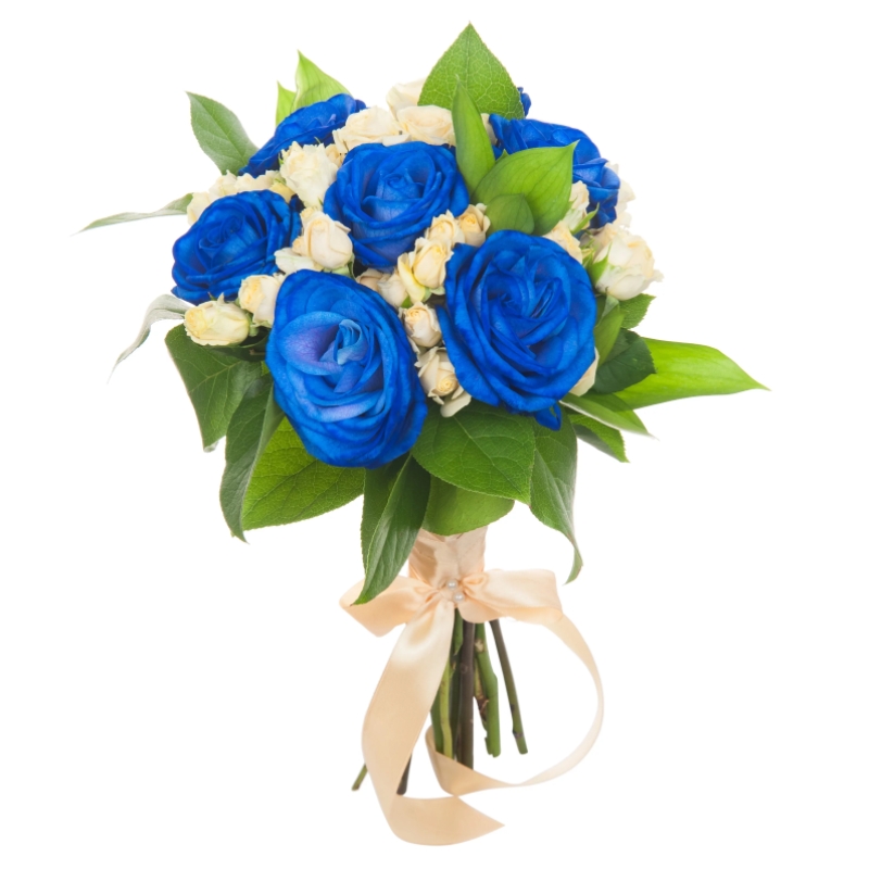 Букет состоит из 7 синих роз, 4 ветки кустовой розы, рускус, прозрачная упаковка, атласная лента.
