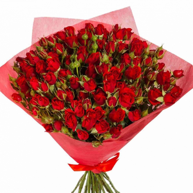 Букет состоит из 15 красных кустовых роз, красивая упаковка, атласная лента.