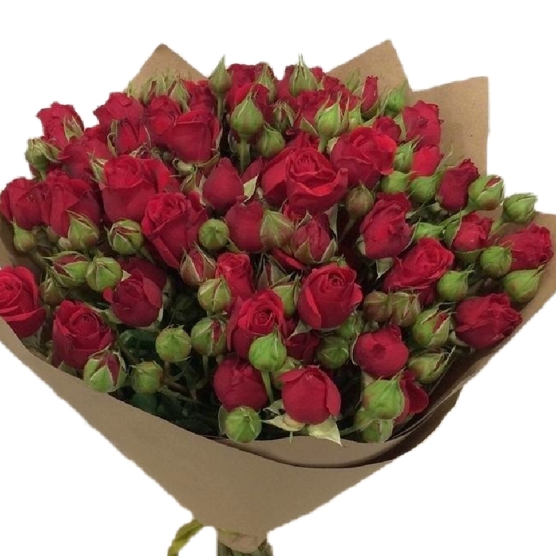 Букет состоит из 11 красных кустовых роз, крафт, атласная лента.