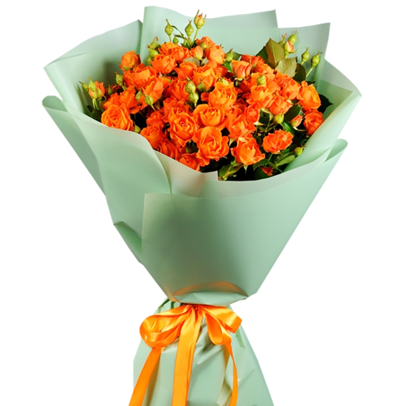 Букет состоит из 13 оранжевых кустовых роз, красивая упаковка, атласная лента.
