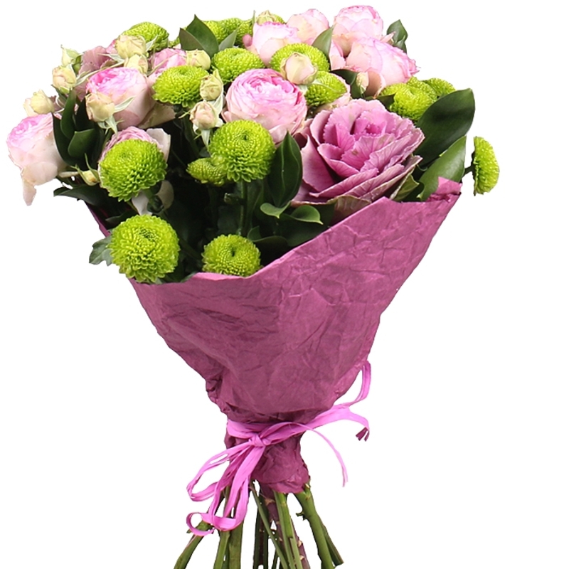 Букет состоит из 3 кустовые пионовидные розы, 3 ветки гвоздики, 2 цветка брассики, зелень, крафт, атласная лента.