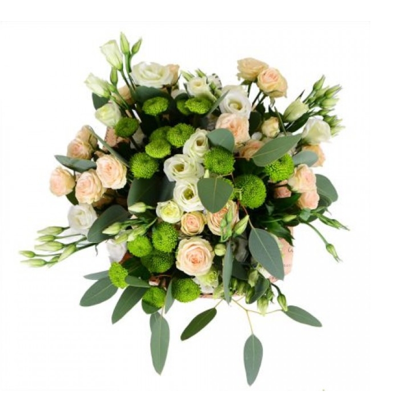 Букет состоит из 5 кустовых роз, 5 эустом, 3 ветки хризантемы, эвкалипт, крафт, атласная лента.