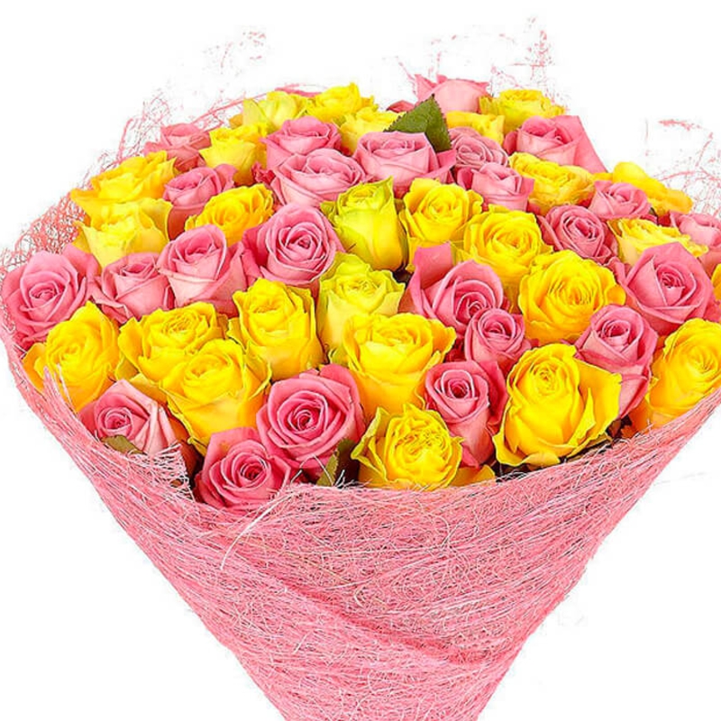 Букет состоит из 23 розовые розы, 22 желтые розы, красивая упаковка, атласная лента.