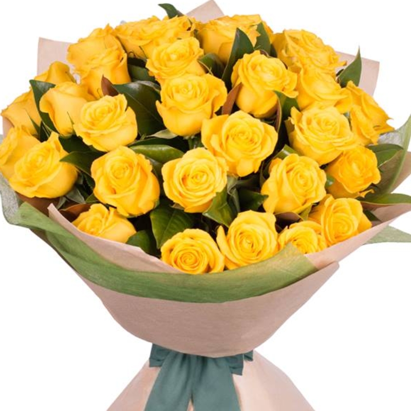 Букет состоит из 35 желтых роз, зелень, крафт, атласная лента.