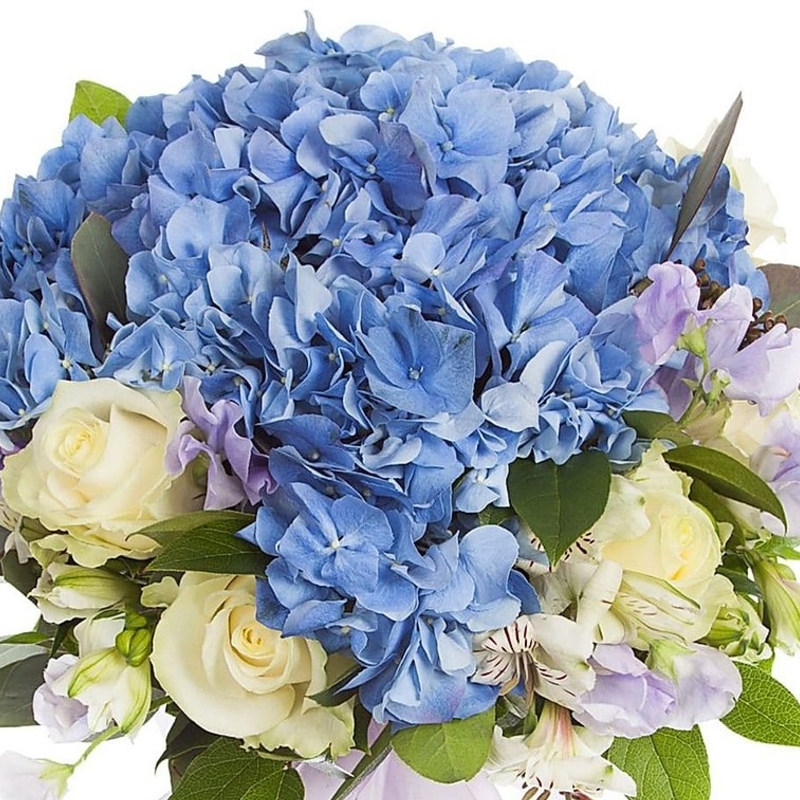 Букет состоит из 1 синяя гортензия, 7 белых роз, 4 ветки альстромерии, зелень, прозрачная упаковка, атласная лента.