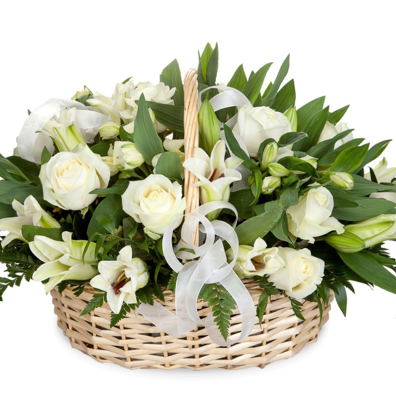 Букет состоит из 11 белых роз, 6 альстромерий, 4 лилии, зелень, корзина, оазис.