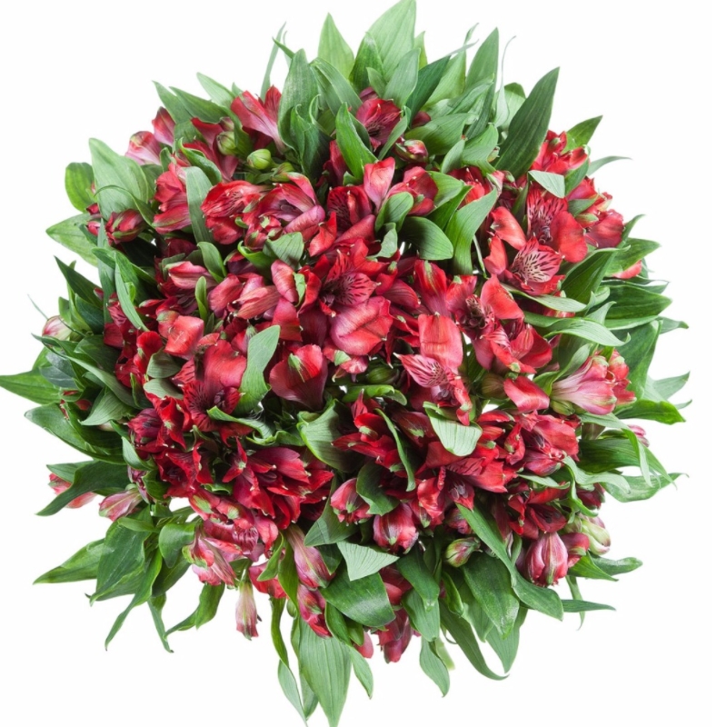 Букет состоит из 19 красных альстромерий, зелень, прозрачная упаковка, атласная лента.