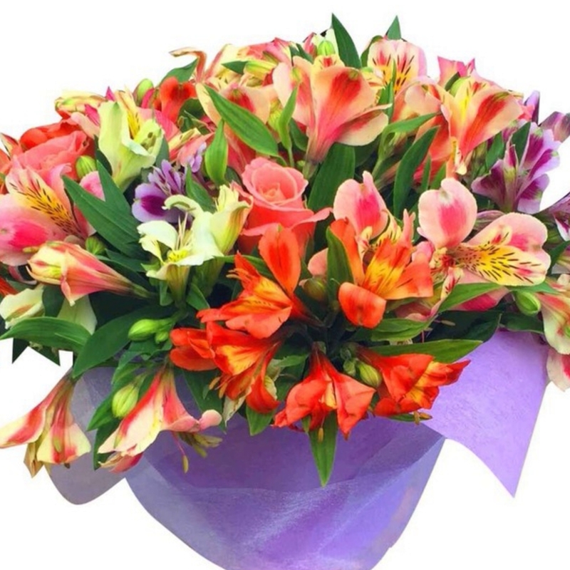 Букет состоит из 15 веток альстромерий, 3 розовые розы, зелень, красивая упаковка, атласная лента.