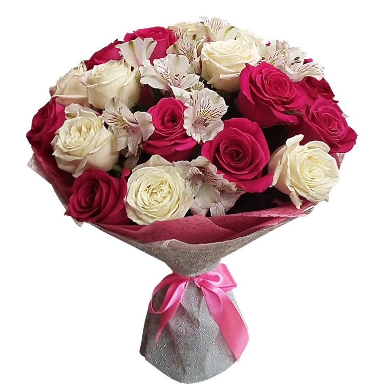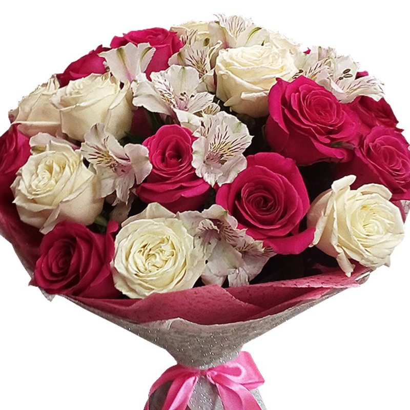 Букет состоит из 9 малиновых роз, 8 белых роз, 6 веток альстромерии, красивая упаковка, атласная лента.