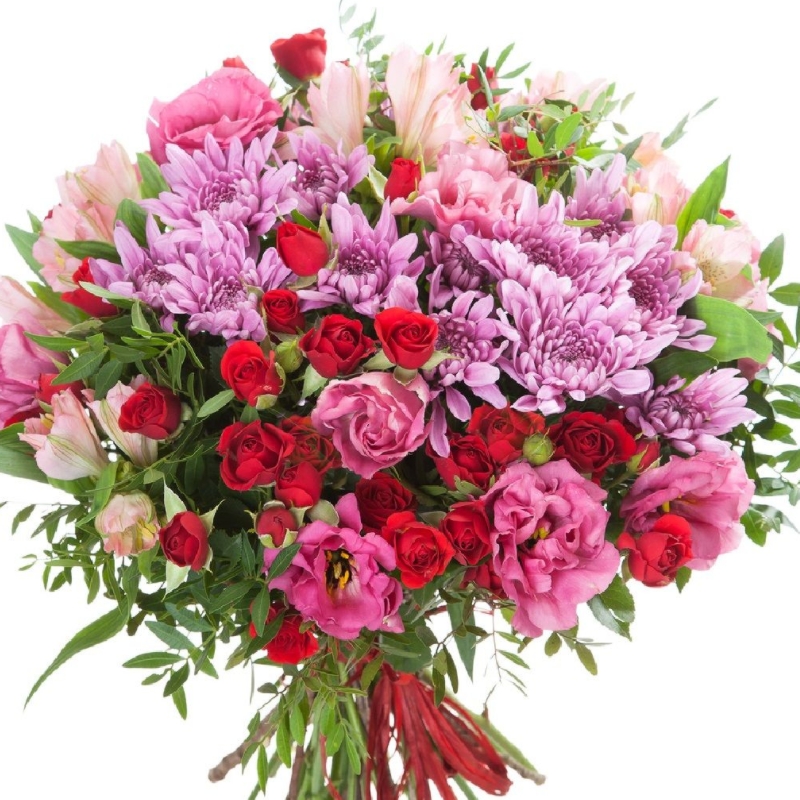 Букет состоит из 5 кустовых роз, 4 эустомы, 5 альстромерий, 3 ветки хризантемы, зелень, прозрачная упаковка, атласная лента.