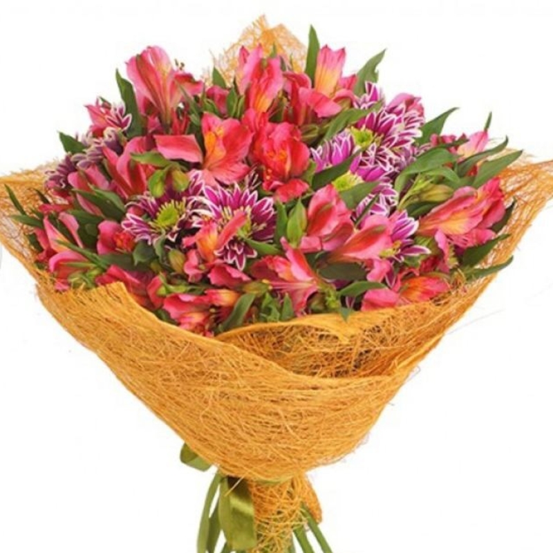 Букет состоит из 5 веток альстромерии, 4 ветки хризантемы, зелень, красивая упаковка, атласная лента.