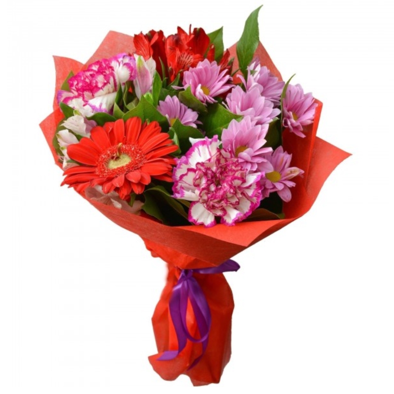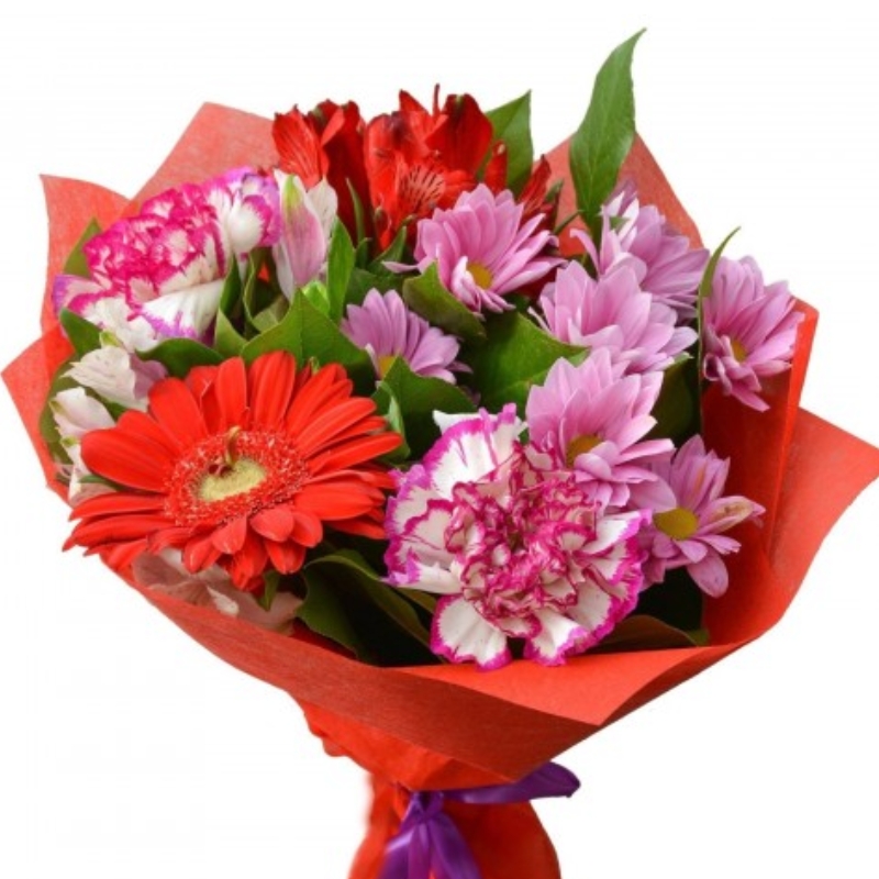 Букет состоит из 1 гербера, 2 гвоздики, 2 альстромерии, 2 хризантемы, зелень, красивая упаковка, атласная лента.