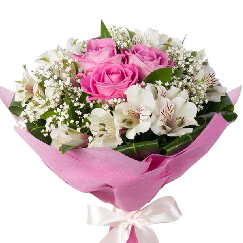 Букет состоит из 3 розовые розы, 6 веток альстромерий, 2 ветки гипсофилы, аспидистра, упаковка, лента.